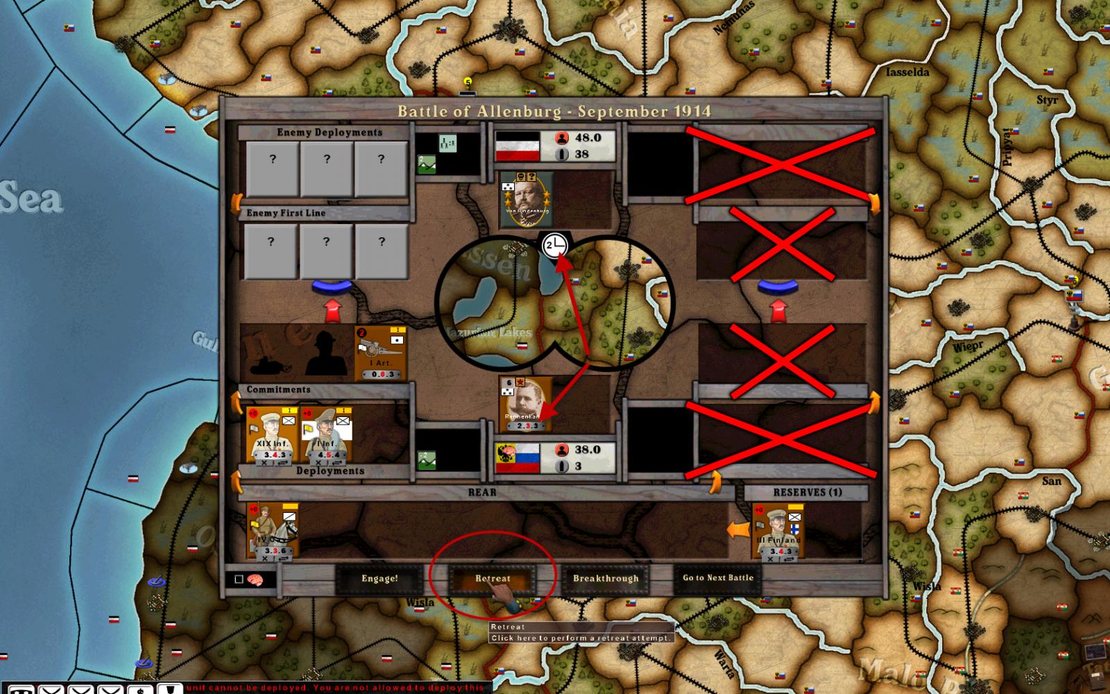 In the attached, you can see the Russian I Army has only attacked for 2 rounds, but its commander has an obstination value of 3. However, the retreat button is activated (in the red circle) after 2 rounds, and I was able to retreat. Russians should have been required to go another round (they didn't take a panic result, just a "1" result in round 2).