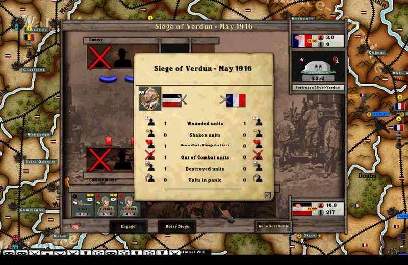 Verdun has finally fallen. This Province was surrounded for a long time, but never actually entered the "siege" stage until may of '16-after the non garrison units were destroyed. This belated victory has released the 5th Army for operations elsewhere. It will move by train and foot to its new position between the 4th Army (in Paris) and the 13th Army. This will be followed by a broad front attack into the south of France.