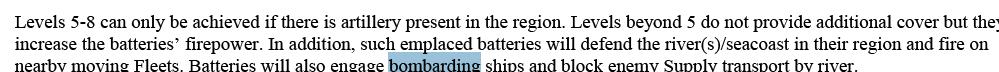 That's straight from the user manual. The way I have always understood it a fleet can only be bombarded by coastal batteries when it moves into or out of the gun's adjacent coastal region. AmI just mis-reading this, or did this get changed with a patch? I just had a stationary fleet bombarded in my PBEM game.