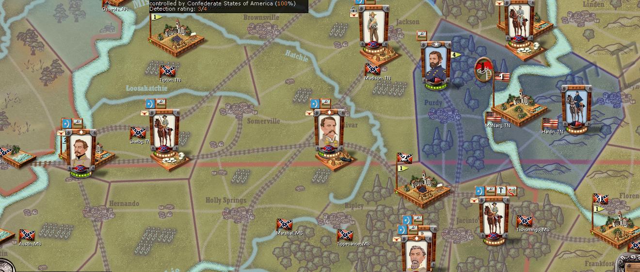 In Mississippi, the USA advance from the South is in full swing. The attacks come from the river. Port Hudson and Baton Rouge have fallen. Forrest remains entrenched at Springfield. In the North, Crittendon's Corps has arrived at Grant's location. A USA offensive seems inevitable aimed towards Corinth and Memphis.
