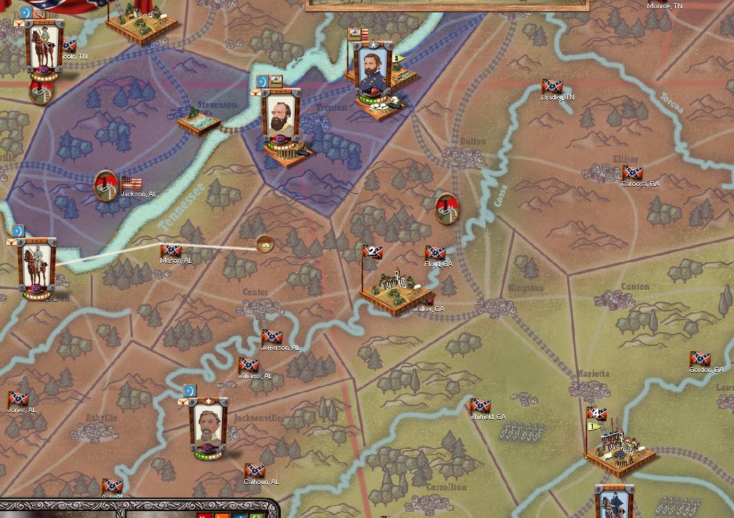 TN:Cav elements from both sides disperse, no engagements. Several rails in CSA territory have been destroyed, however. 3rd Kentucky US Cav continues its pacification programme, subduing Jackson. CSA elements move to the front lines as well, Livingstone falls.