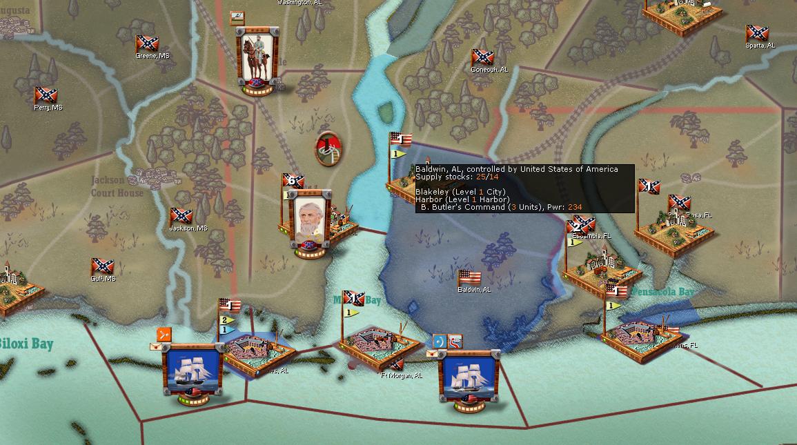 A fairly quiet turn. Grant sits in recovery. USA cav is invading deep into central Alabama and Mississippi. USA has also wrested control of the Mississippi's mouth.