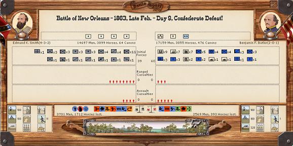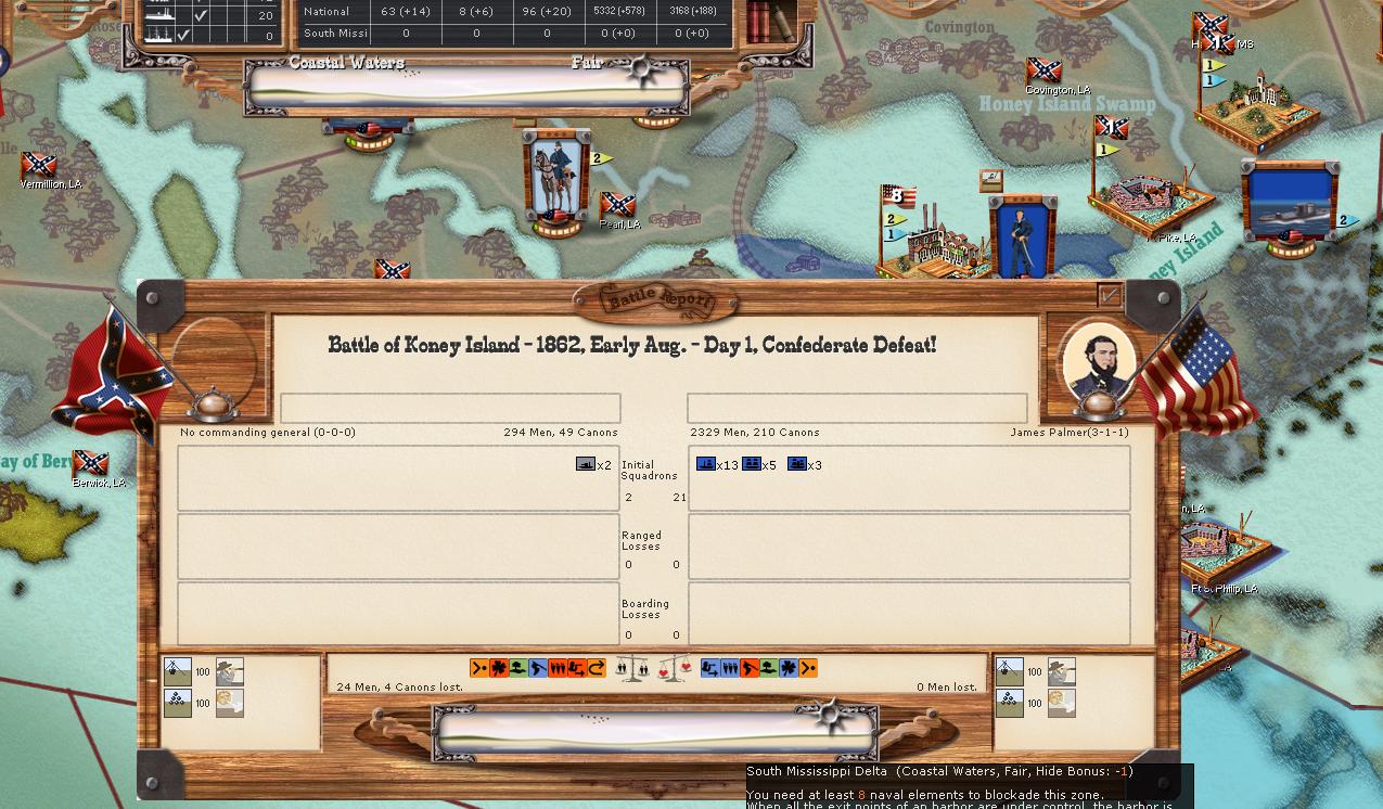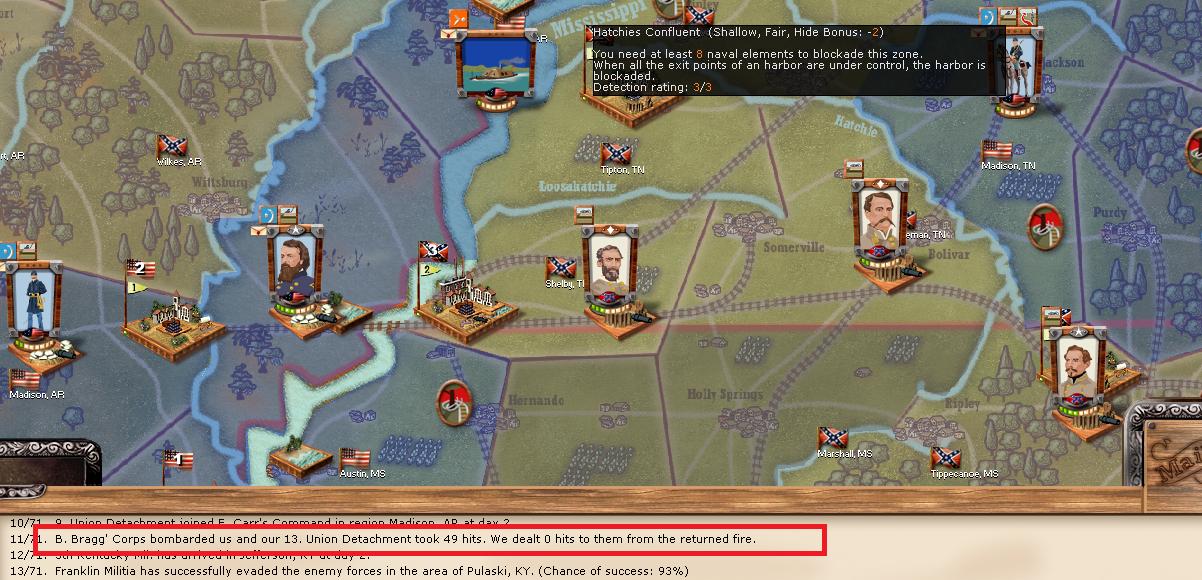 USA Army of the West captures Fayette AR. USA forces are once again repuled at Galveston. Crittendon's Corps moves towards Vicksburg, Jackson falls. Other theatres remain quiet, but the Mississippi and Arkansas managed to slip by USA naval elements into Mobile Bay. Notably, USA has taken point lead and the casualty gap is growing.