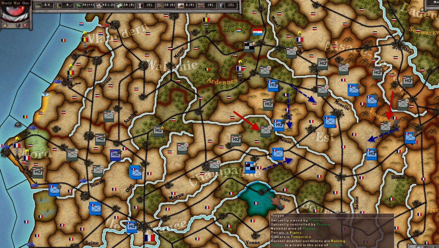 GE IV attempts to send one corps into Belgium to convert the rail line, but the FR IV Army intercepts and beats them back in two ugly rounds for the Germans.