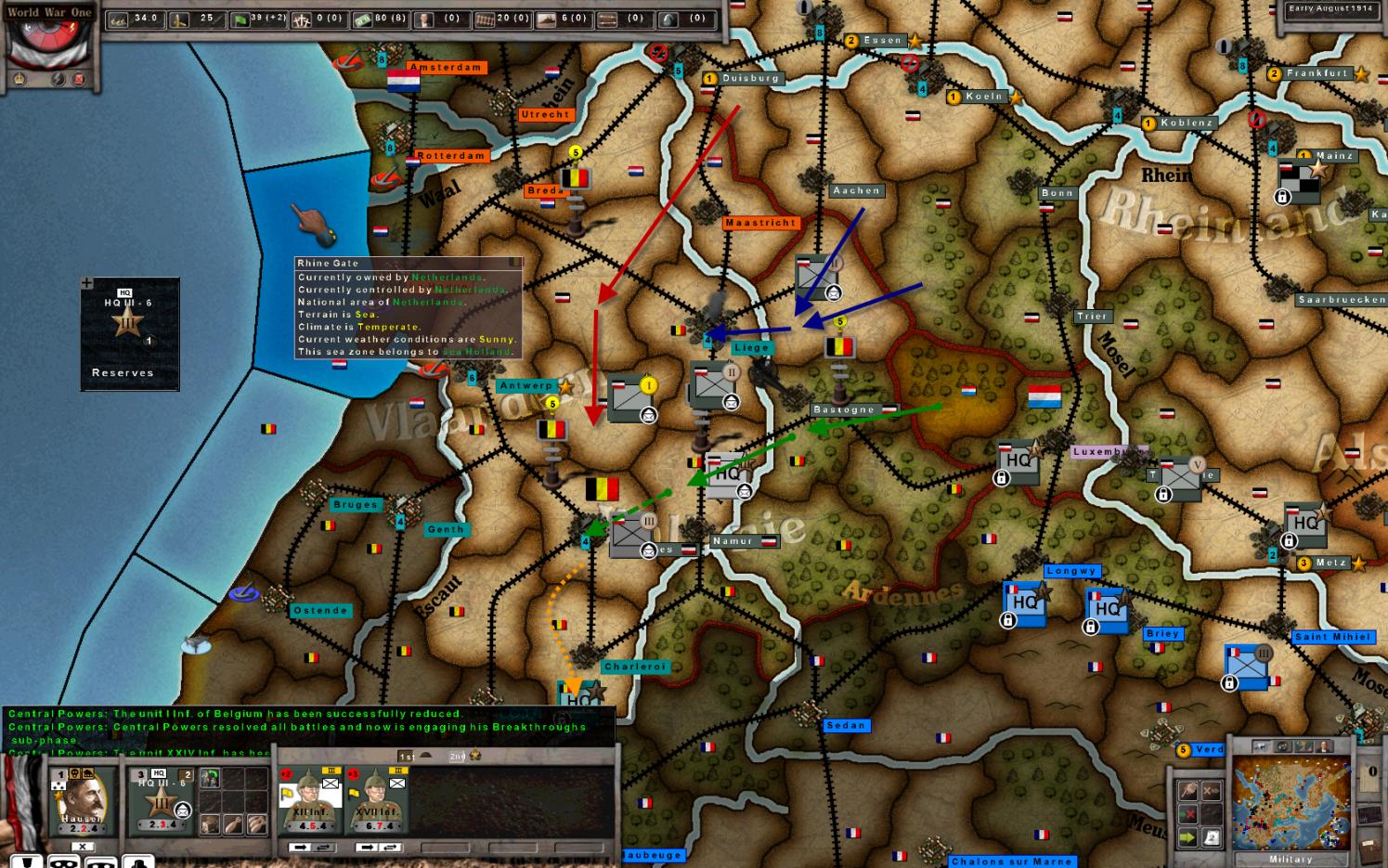 GE I - Moves through Maastricht, into two areas to the West of Liege but avoids Antwerp. I created a cav detachment with the 2 cav corps for exploitation in the full August turn. No intercept from the Belgians in Brussels. See red arrows in the image.