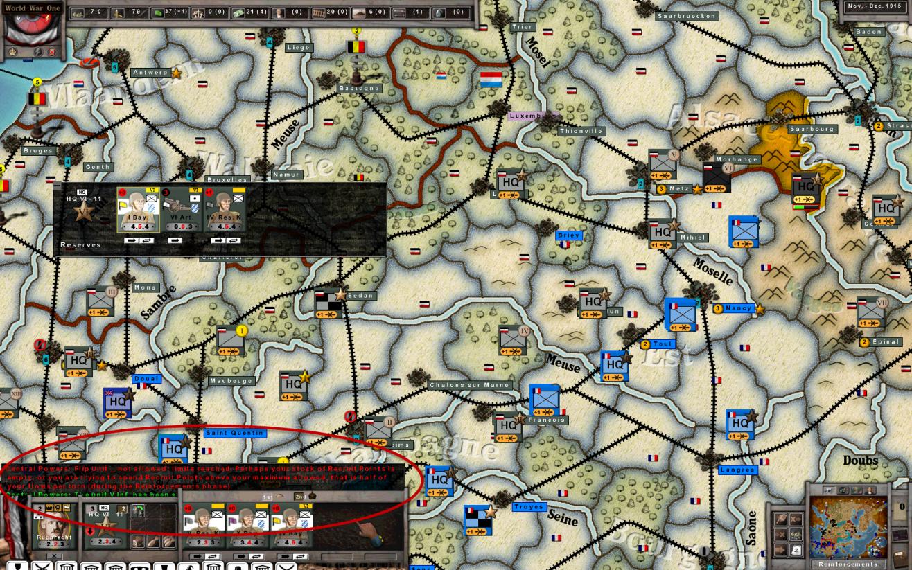 Well, the error message just said I was trying to use more than 1/2 my RP flow, and I was unable to go to any other German Army and spend a 7th RP. I will confirm in my next turn and send you the .sav / .map files.