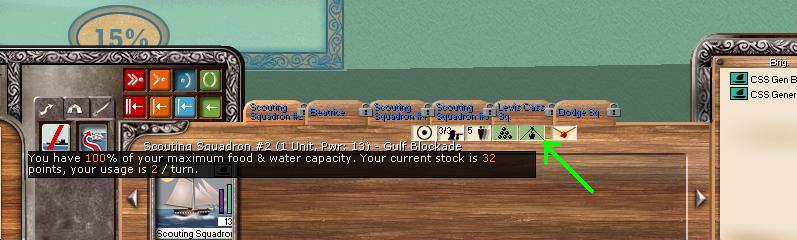 Here we have the wonderful Gulf of Mexico, pretty scenic this time of year I hear. But wait, what does my wondering eye spot, but scouting squadron # 2, sailing peacefully around. Note the green arrow. It points to the supplies on the ships (2 ships in the squadron). Right below is the ingame tip stating that I have 32 supply points, and that I use 2 per turn. This means that my ship can stay at sea for 16 turns before running out of supply. :w00t: Now look below, my ships have come in. :thumbsup: And what's this, they brought little Johnnie his musket (Huzzah!). Really it is money and WS. However, they only bring me gifts as long as they are in the blockade box (the game assumes they bring the loot in, and escapes them Yankees).