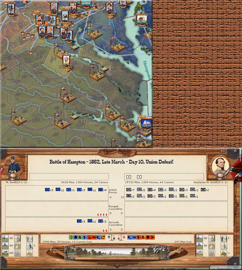 States casualties are caused by the 64 guns raining lead tear down upon them. The CSA charge overruns the rest, wiping out two line regiments. During the retreat the fleeing Union troops managed to spike 12 of their 10 pounder's before the Confederates were able to capture them. About 900 men are able to escape the initial onslaught. 12 20 pounder's and the Union wagon train were in the rear so they were able to escape to Fort Monroe. The Confederates captured 2000 rifles, 59 supply carts and 13 crates of ammunition. Pursued by Smith's two cav Regiments, the 600 men of First, Second, Third, and Fifth New York militias have surrendered, ending a bloody day for the Union. CSA captured Hampton Rhodes, its port, Depot and most importantly strategic points to guard the James River from any Union naval incursions. Gustavus Smith and subordinates Ewell and Jones have been congratulated. The Union commander M. Smith is recovering from wounds across the Bay in Drummond Delaware. He was blamed for the heavy losses and loses seniority. He will forever be remembered as the faceless general who lost at Hampton Roads and put Fort Monroe in a dire situation. He shall never have a portrait photograph like all the other generals!