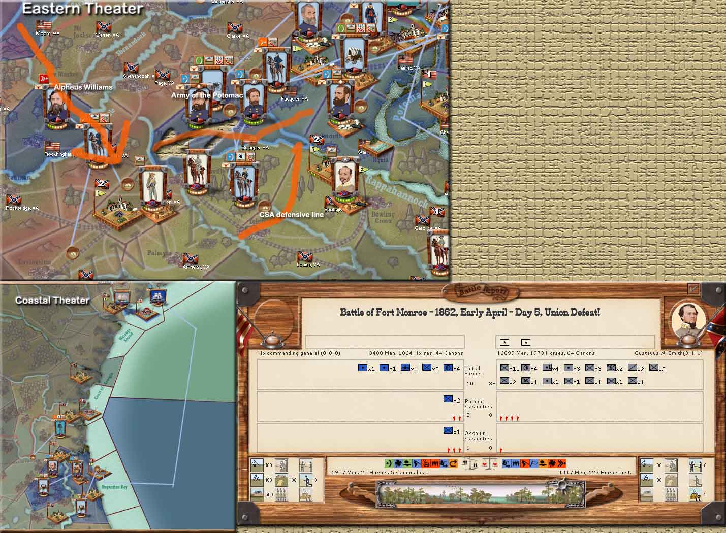 At Williamsburg, CSA Smith's Corps is prepping for an attack on the union entrenchments at Hampton.