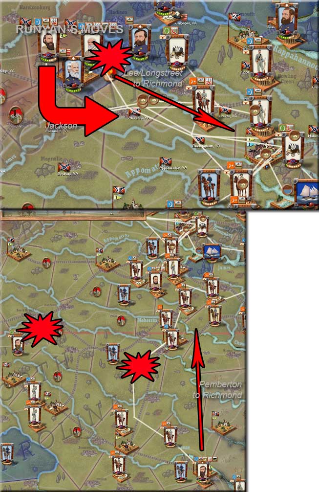 Lee's corps after marching to the guns goes back to the Albemarle (Chancellorsville) region, but in passive posture, not defensive. This puts him at the mercy of any Union force that moves into the same region during the turn, which in fact happens. This means Lee is forced to retreat out of the Albemarle region.