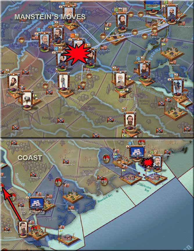 Shifting South, Manstein has finally consolidated his hold on Charleston by conquering its last Fort, Meade. He is sending all his divisions into the city for some well-deserved R&R. Runyan's Gen. Walker has laid siege to Savannah, but apparently sensing an inability to capture it due to Burnside's close proximity in Fort Pulaski has given orders to send him to Atlanta which is under siege by Manstein's cavalry elements.