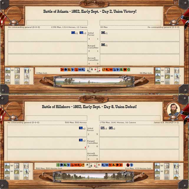 Longstreet and Jackson retreat North into the mountains- a rather awkward position for Runyan. Lee retreats to Albemarle, and encounters Franklin again. He is able to retreat back to Charlottesville explaining his presence there in passive posture alongside Sumner, also in passive posture. It can only be left up to speculation as to how the union gained 59% military control at Charlottesville by being in passive posture. My best guess is Sumner was blocked when he attempted to retreat in passive and reverted back to attack and then back to passive again when Lee arrived, but there's no explanation in the report. Note to designer: we need more after action battle description :-) A strange battle indeed.