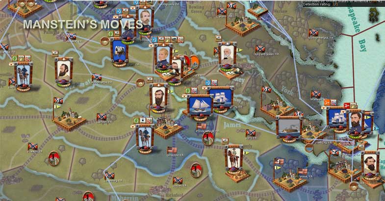So now we're looking at a dramatic race back to Richmond. Hooker has magically transported North. He and Meade have been promoted and are charged with capturing that city. After all the region to region cautiousness Manstein has ordered Meade to jump over three and land straight on top of Richmond. He has also ordered Porter to jump on Fredericksburg. Runyan has ordered Lee and Longstreet as well as Pemberton from the South to converge back to the Richmond fortifications. Jackson, whose troops are enfamished is marching south into the Roanoke region and over to Amherst region South East of Charlottesville. Inevitably the crisscrossing forces will collide somewhere.