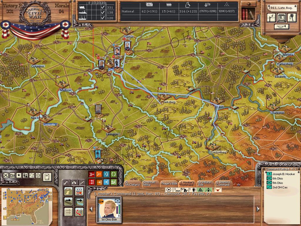 Well MrT seems to be going after Kentucky in strength! McClellan will continue training the mountain corps so all that's is free to oppose the rebels is 3 bde's under hooker. He'll remain at Lexington for now I'd like to see how far MrT will push into KY. I may be able to swing around his forces once division formations open up.