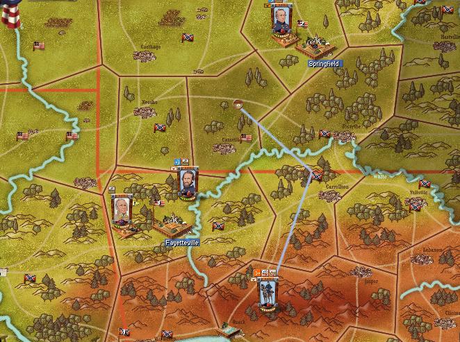 Lyon couldn't make it to Springfield last turn, however, he is now only 4 days away with a forced march. Hopefully his forces can save the depot so as to lose no time in the push into northern Arkansas.