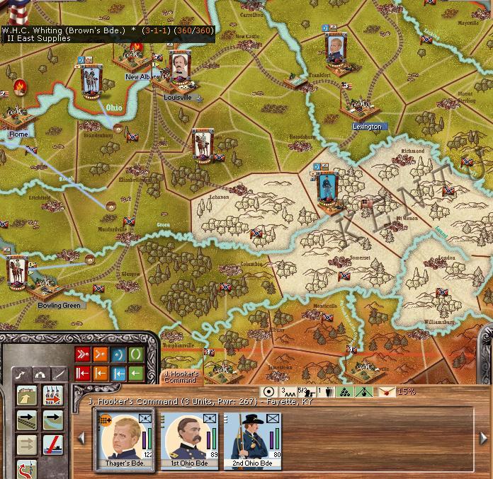 As expected the rebel forces under General Whiting have taken Louisville! MrT is creating a wide line to hold...Hooker will entrench at Lexington and await further developments.