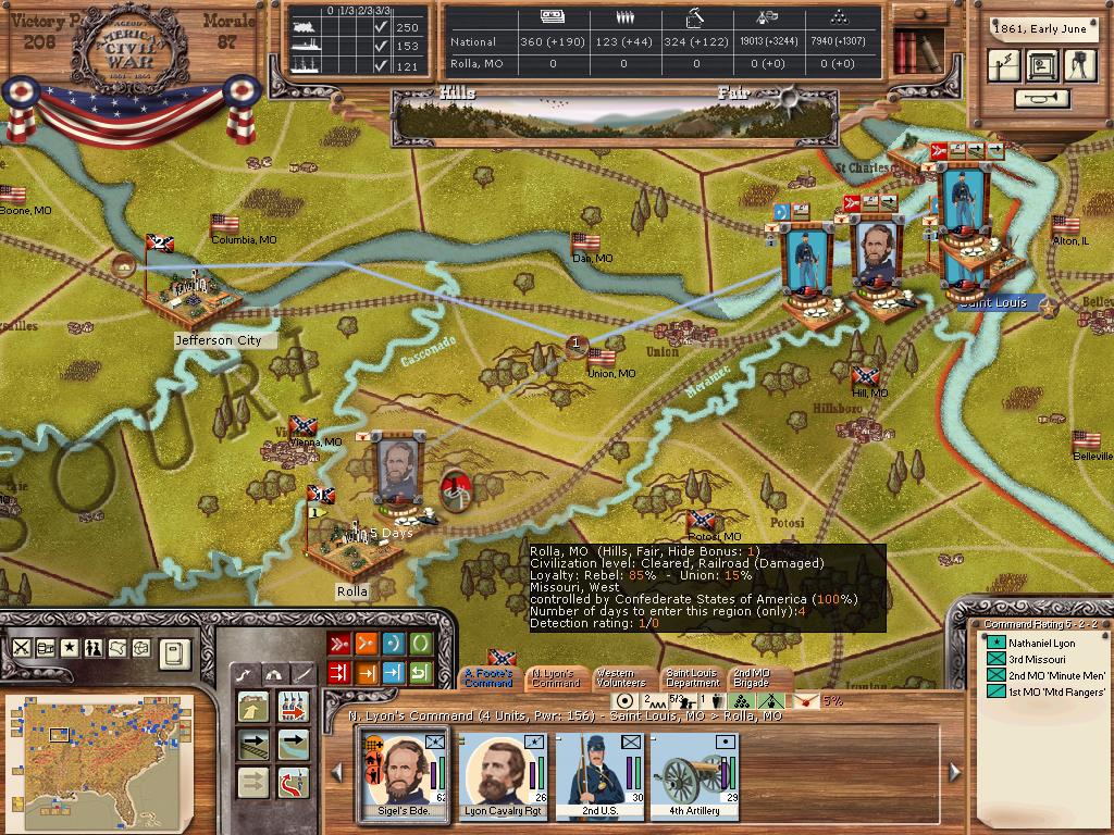 After the St. Louis massacre loyalty in Missouri has plummeted. I've ordered an offensive to take back the capital. Lyon with the main force will hit Rolla and try to bring Price's militia to battle in the next few weeks.