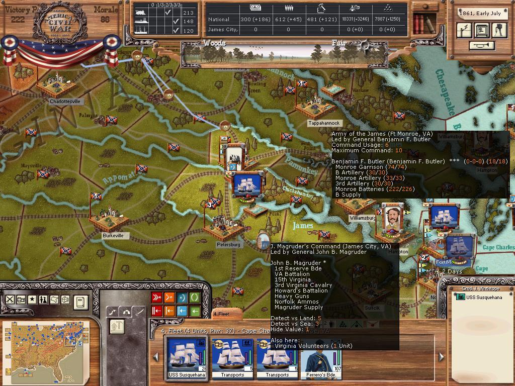 As for amphibious operations in '61...I'm not playing anything major at all. Reinforcing Ft. Monroe in order to keep my foothold on the peninsula is all. My main task is going to be protecting Washington, Annapolis, and Baltimore from the likes of Jackson.