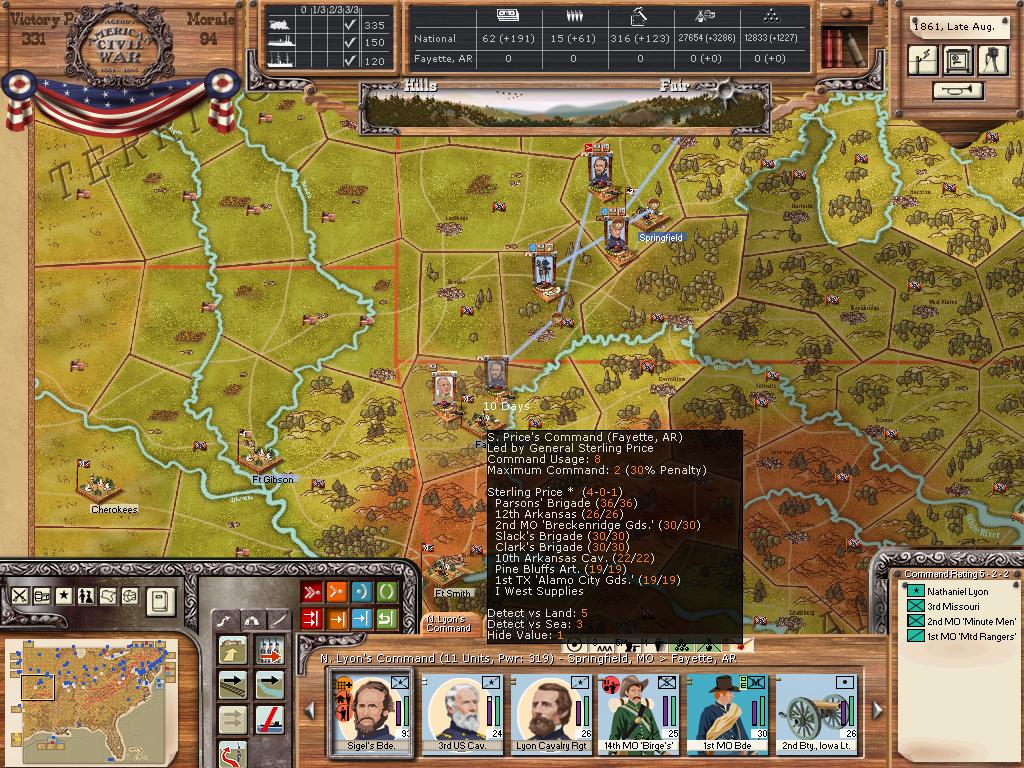 Lyon couldn't make it to Springfield last turn, however, he is now only 4 days away with a forced march. Hopefully his forces can save the depot so as to lose no time in the push into northern Arkansas.