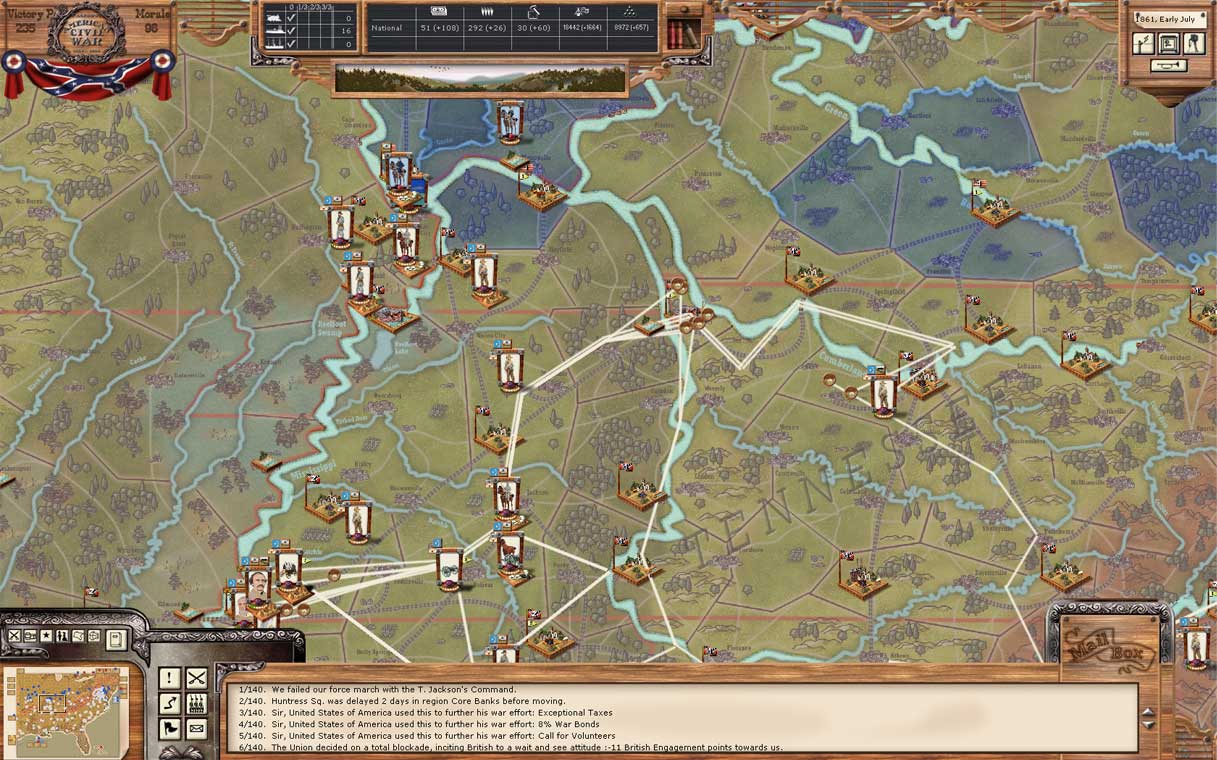 I cannot wait for defend Washington, so, because this is the first turn where the troops can be purchased, I play some options: Call for Volunteers (paying 1.000$ and recruiting 245 companies), Total Mobilization (683 companies), 8% War Bounds (367.000$) and Exceptional Taxes (440.000$).