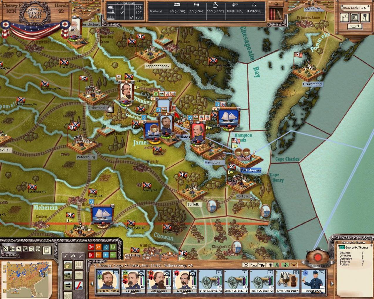 The has arrived safely around Suffolk and Norfolk! General Meade's corps is commencing seige operations against Norfolk itseld, while Thomas' and Hooker's corps are secuing the harbour at Suffolk. I had wanted to repair the rail lines when I sent the turn in to MrT, however, it looks as though I forgot to click the special order :bonk: