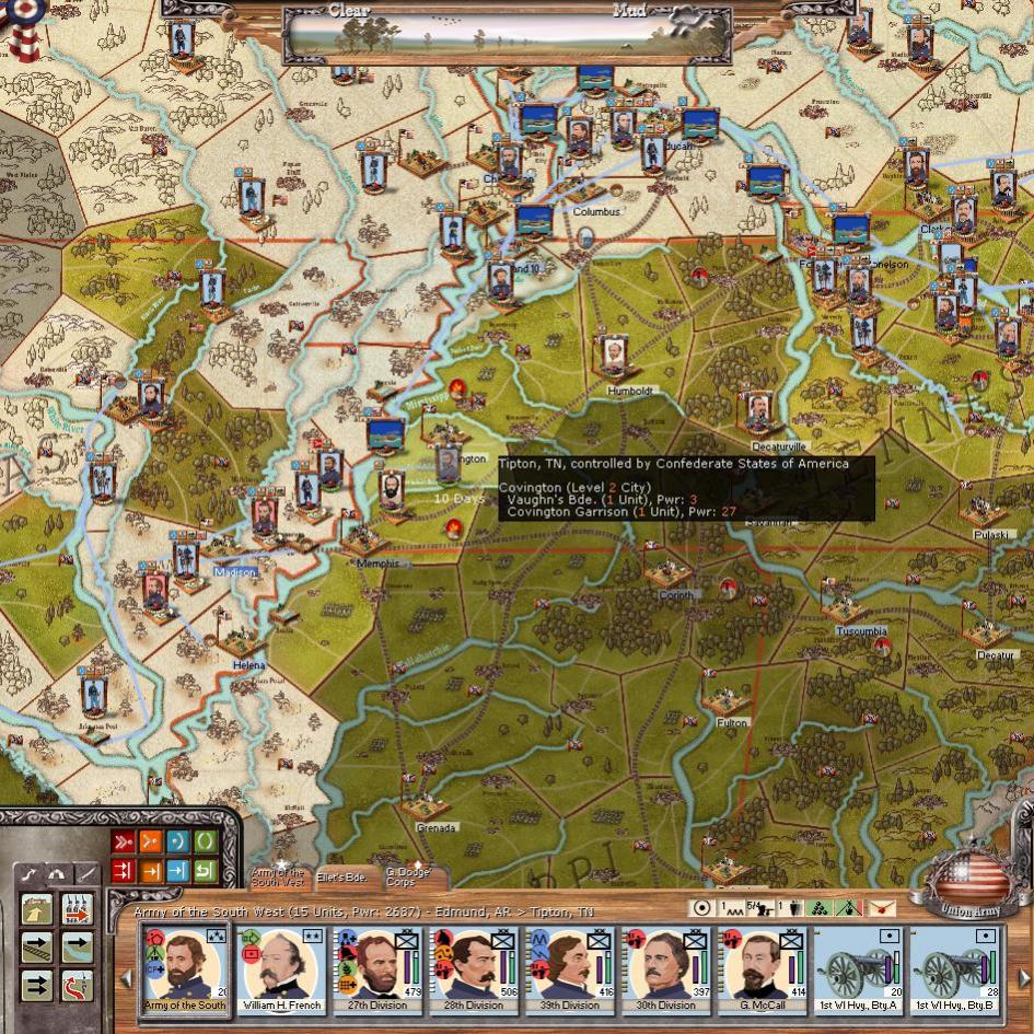 Grant's army is concentrated across the river west of Memphis. There 3 rebel divisions outside the city, one of them being Cleburne's command which is extremely weak, I'm guessing very low on cohesion.
