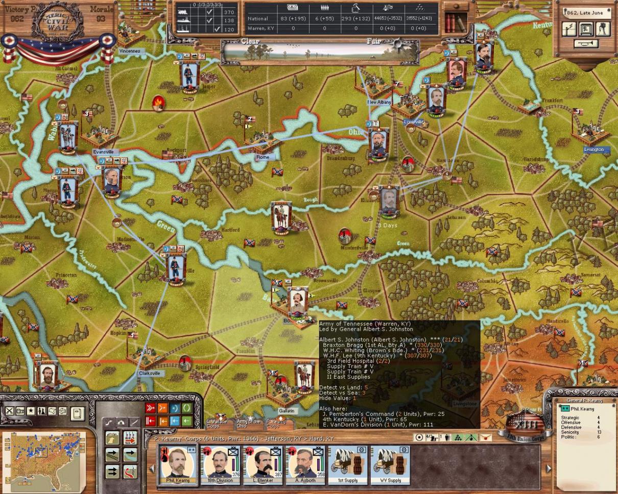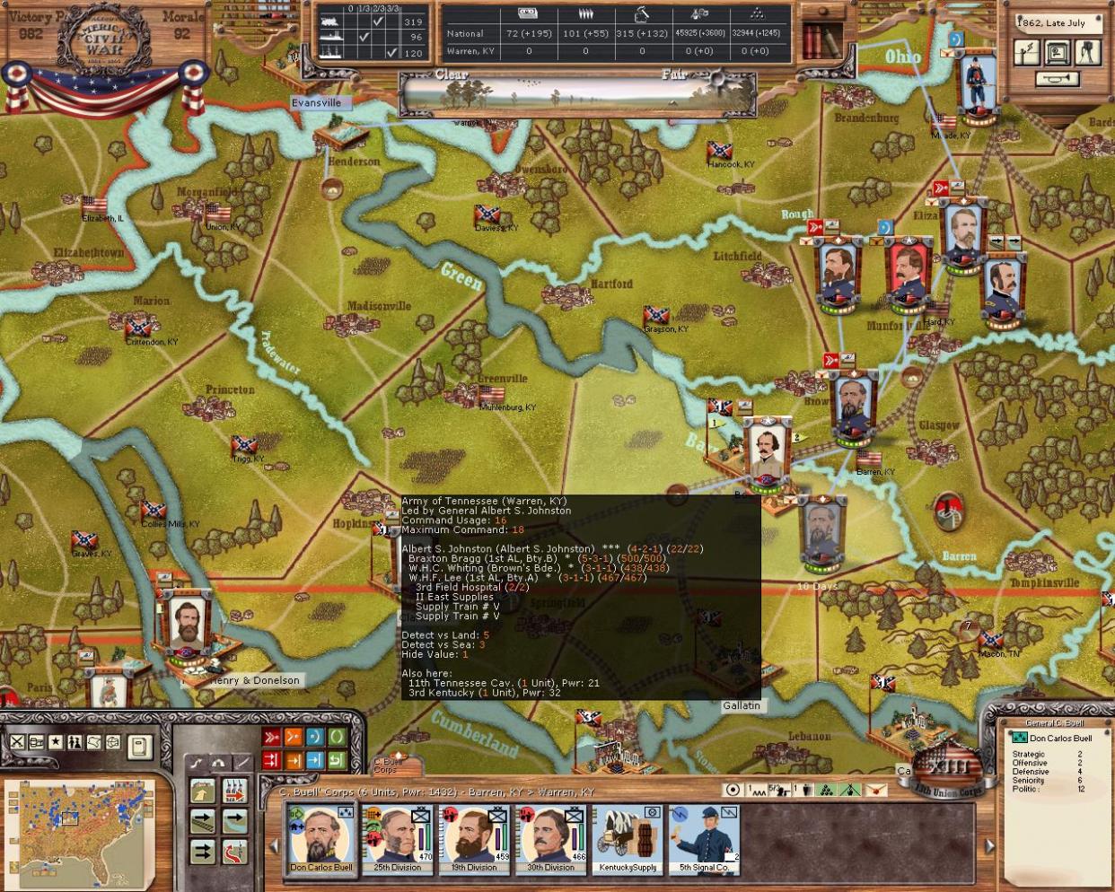 The army is beginning it's advance on Bowling Green. Unfortunately, a few turns ago I had river transports on the way to construct a depot at Henderson, kY, however they were sunk! I'll repair the rail lines as I move south and build a depot later. I think there is ample supplies for a few months anyway...
