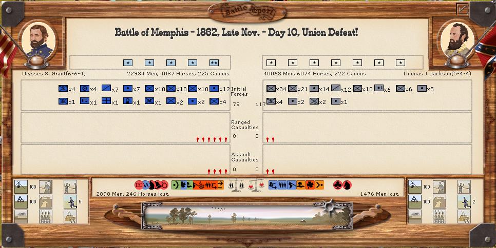 Grant's army is concentrated across the river west of Memphis. There 3 rebel divisions outside the city, one of them being Cleburne's command which is extremely weak, I'm guessing very low on cohesion.