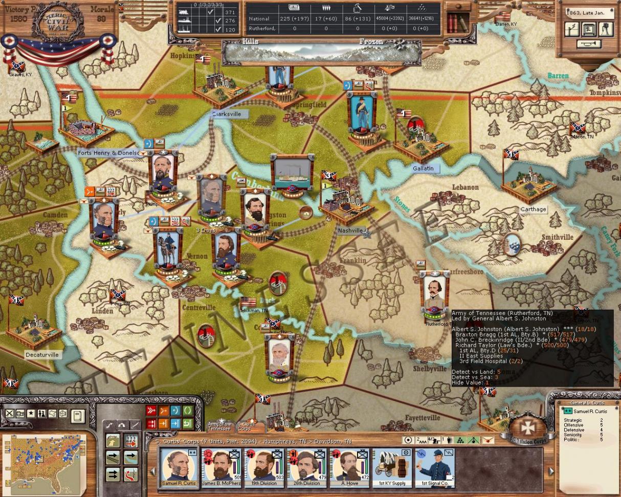 One move by MrT, which is merely a thorn in the side, is his taking of Forts H & D and Paducah by small commands. His forces are all spread out and so I don't believe these moves are permanant or in the least bit threatening. Curtis' corps will take back the forts with 4 divisions leaving the rest of the army to begin the seige at Nashville.