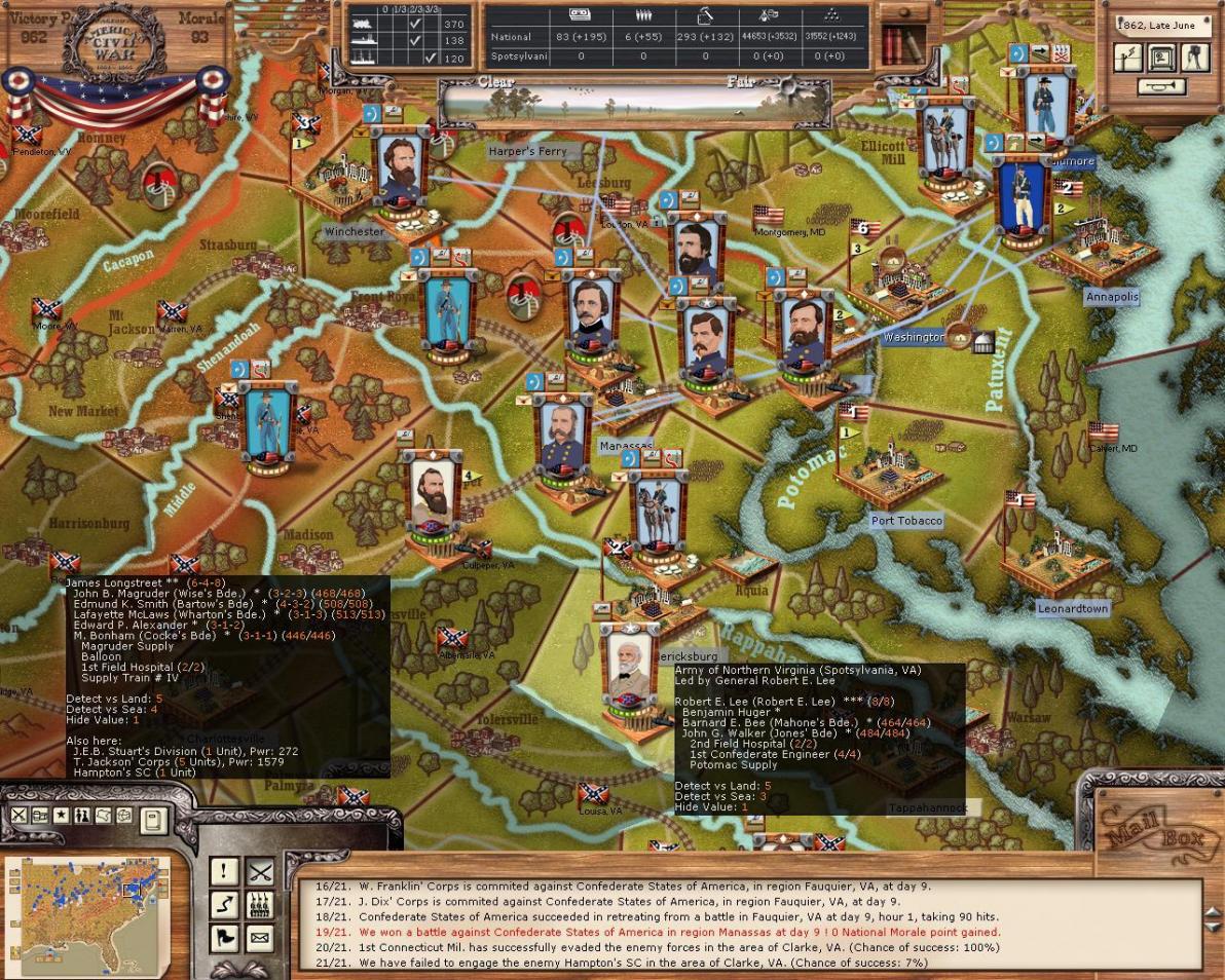 Finally an active General! I've opted to move in with the whole army as I'd like their supply trains to be stocked right away when the city falls. Further, I fear that Jackson and the other corps may move in support of Bory's troops. I was tempted to leave the two corps at Suffolk for this very reason, however, I'd like Hooker to gain some seniority so I can get rid of McClellan who is just useless at this point. Besides I find it highly unlikely MrT will decide to attack Suffolk he must know that even 1 division is enough to take the troops inside the fort.