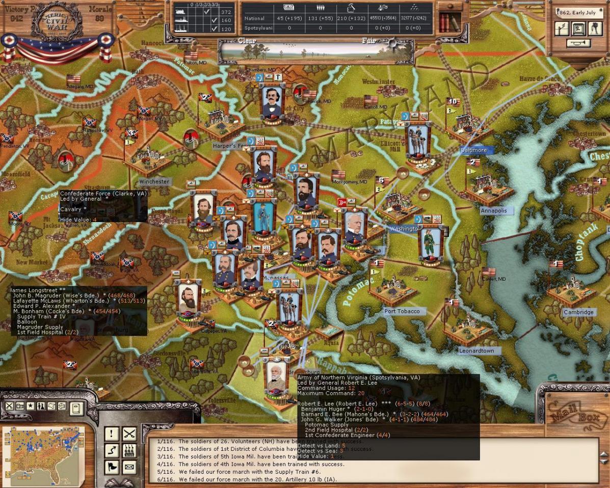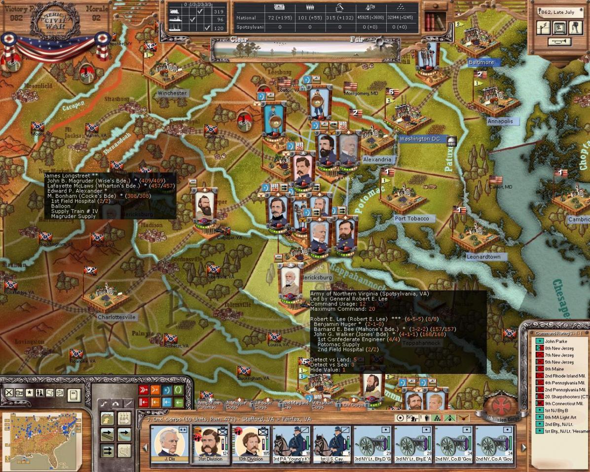 Not much to do in Northern Virginia. The army is partially recovered, however, an entire corps still needs serious refitting. I do want to grab those VPs in the valley once again AND I want to trap JEB who is raiding deep into Pennsylvania with an entire division. So, divisions under Sedgewick and Couch are being railed to the valley.
