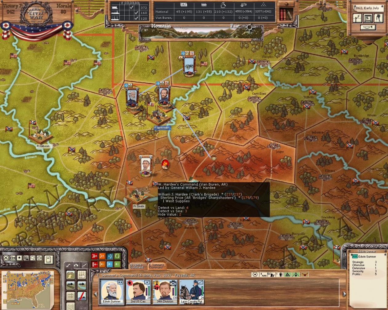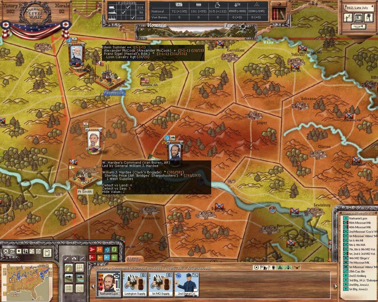 Hardee has crossed the Arkansas river just as Sigels division arrived in Arkansas! I don't know if I could have asked for any better move. Lyon is ordered southeast to take the harbour at Ozark. From here there is a direct route into central Arkansas and Little Rock! Beauty!!! :w00t: