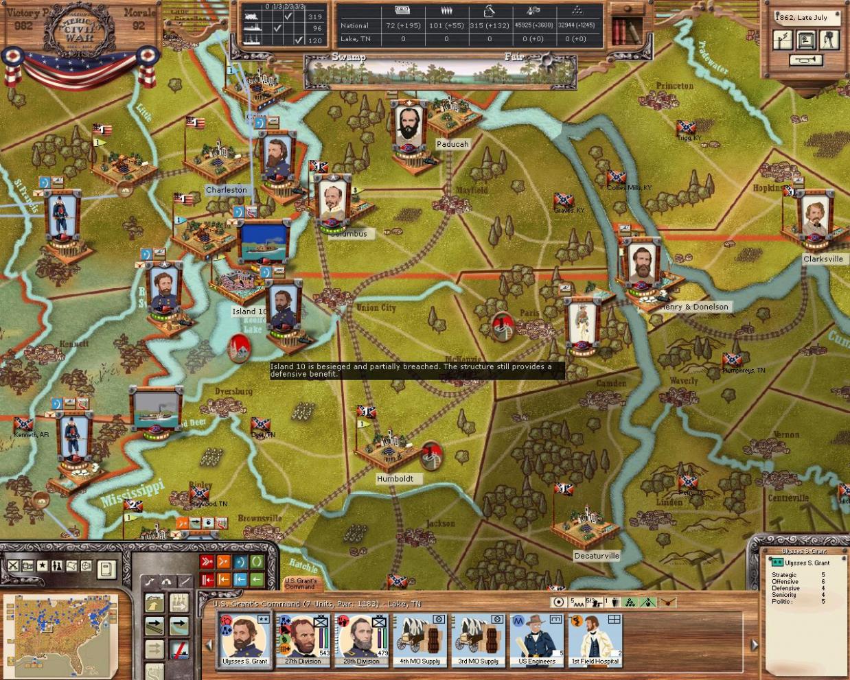 Well island no. 10 is FINALLY totally breached. The garrison's power is down to around 200 so I'll assault and try to get a nice promotion for Grant! I thought about sending Sherman to try and take out Memphis, however, I don't have any reconnaisance units in the area and there may well be a fresh divisions waiting for me.