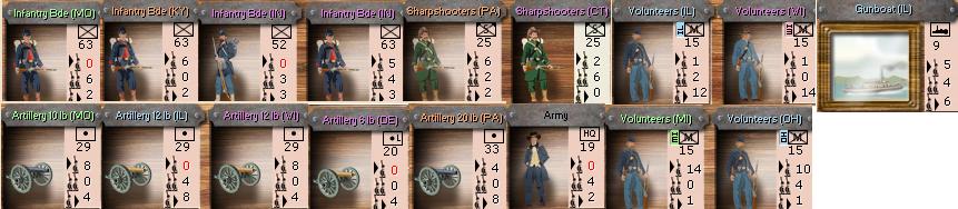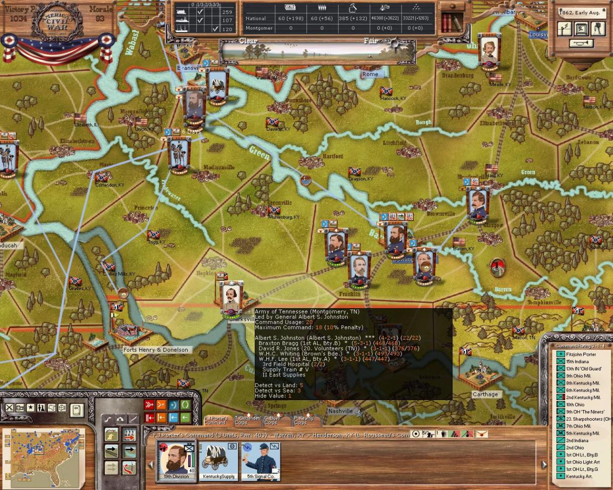 The army is beginning it's advance on Bowling Green. Unfortunately, a few turns ago I had river transports on the way to construct a depot at Henderson, kY, however they were sunk! I'll repair the rail lines as I move south and build a depot later. I think there is ample supplies for a few months anyway...