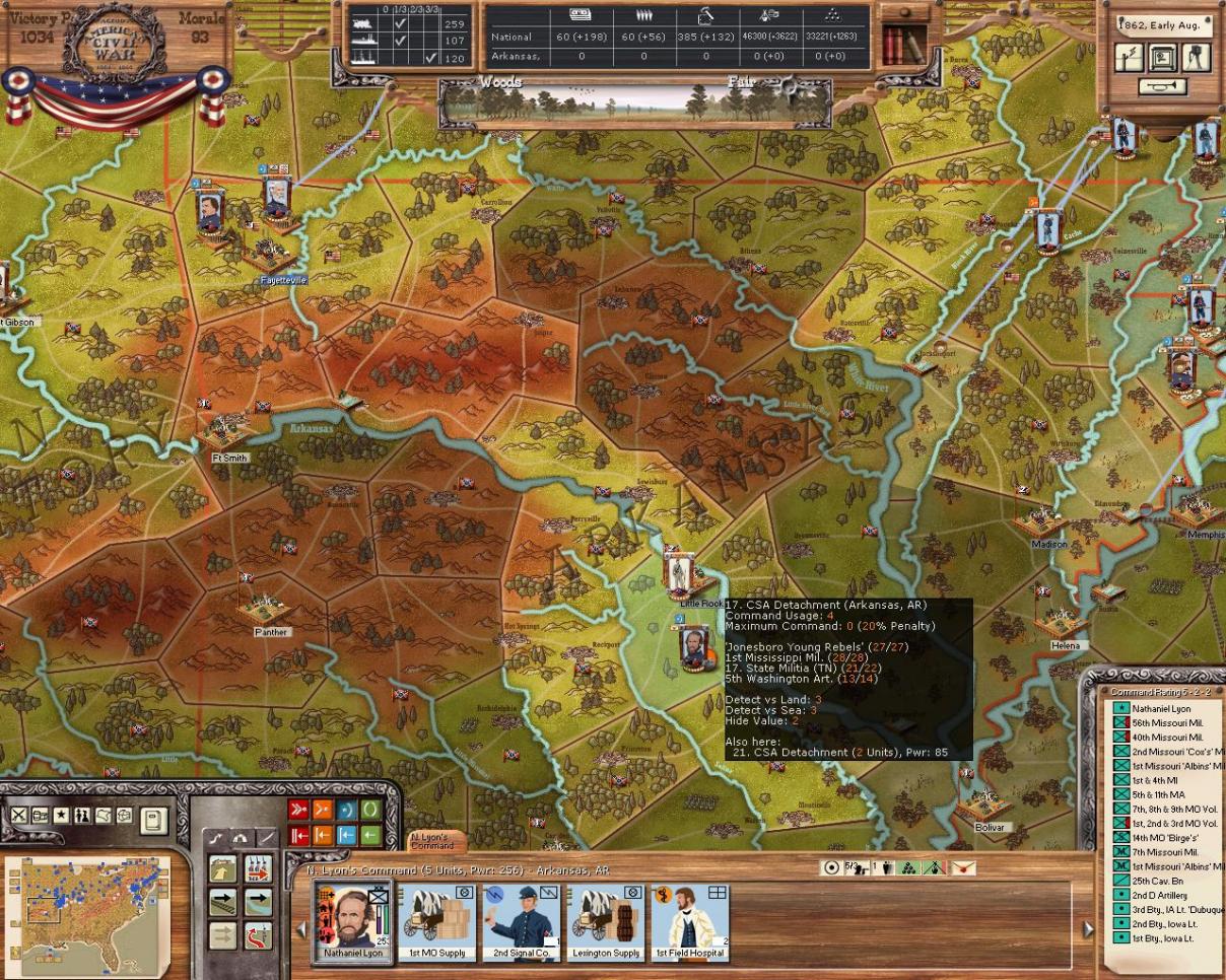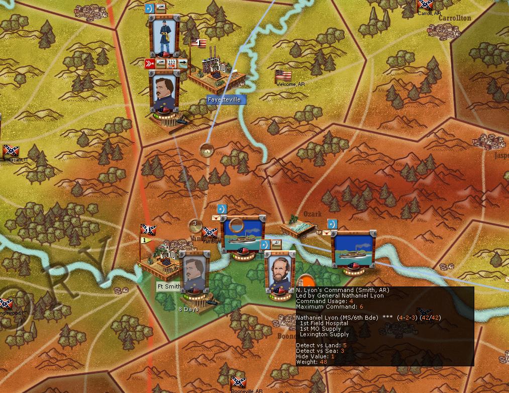 Well Lyon made it to the harbour at Ozark, however it's just my luck, he's inactive! I'm not going to let this spoil the campaign so he has orders to commandeer some riverboats and hightail it to Little Rock. Given that there are two rebel divisions in northwest Arkansas I can't imagine there is anything more than a bde at Little Rock. Even inactive Lyon should be able to take them out.