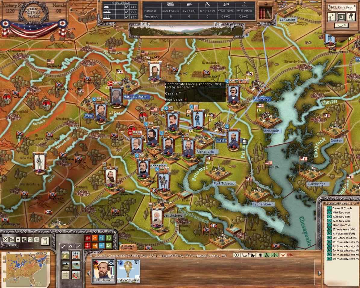 The only big order of the turn is just diversionary, Hancocks new division is ordered to Fort Morgan, NC to gain some experience ( and maybe a promotion!:thumbsup :) for his troops as well as to cause some distraction to MrT for the upcoming campaign.