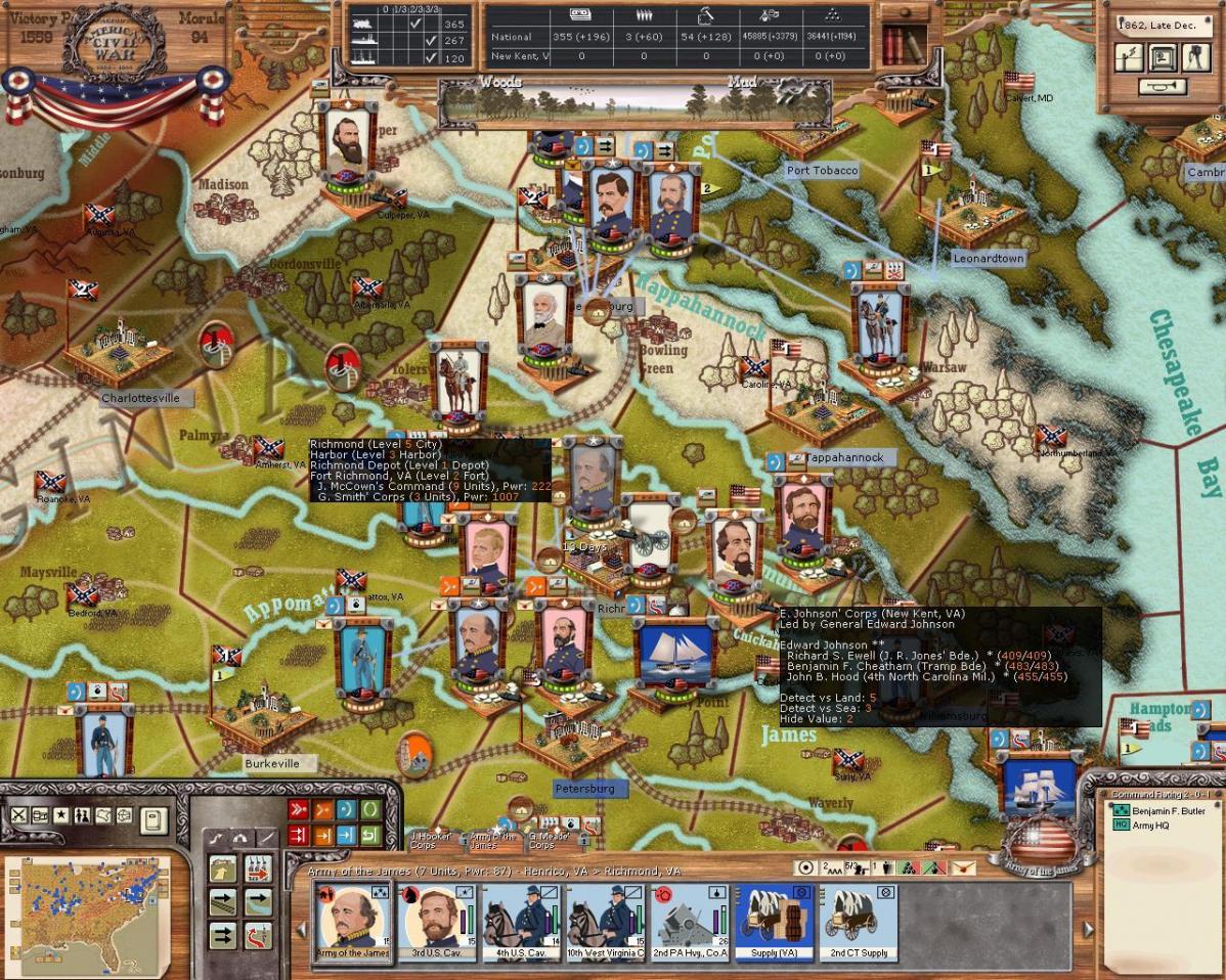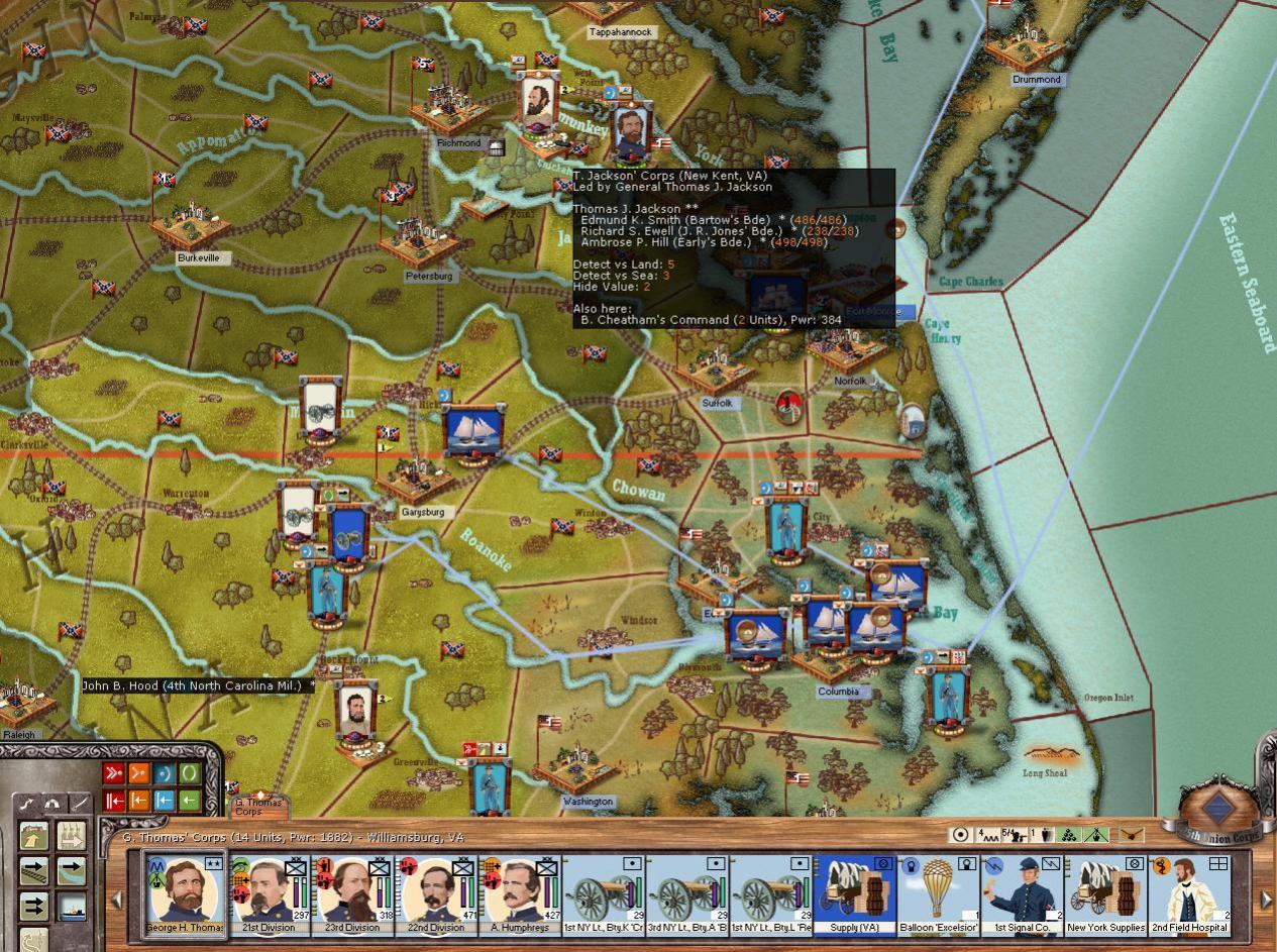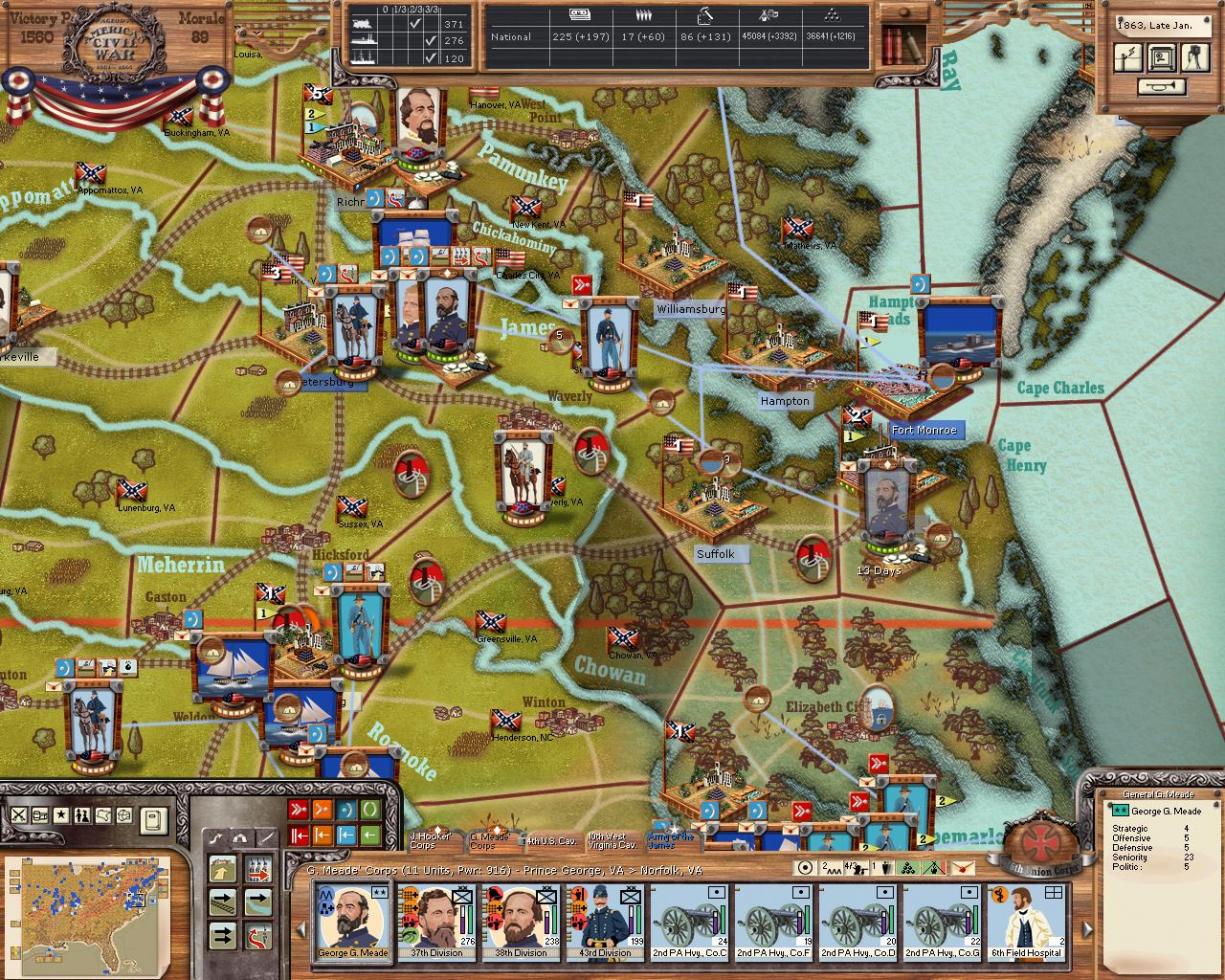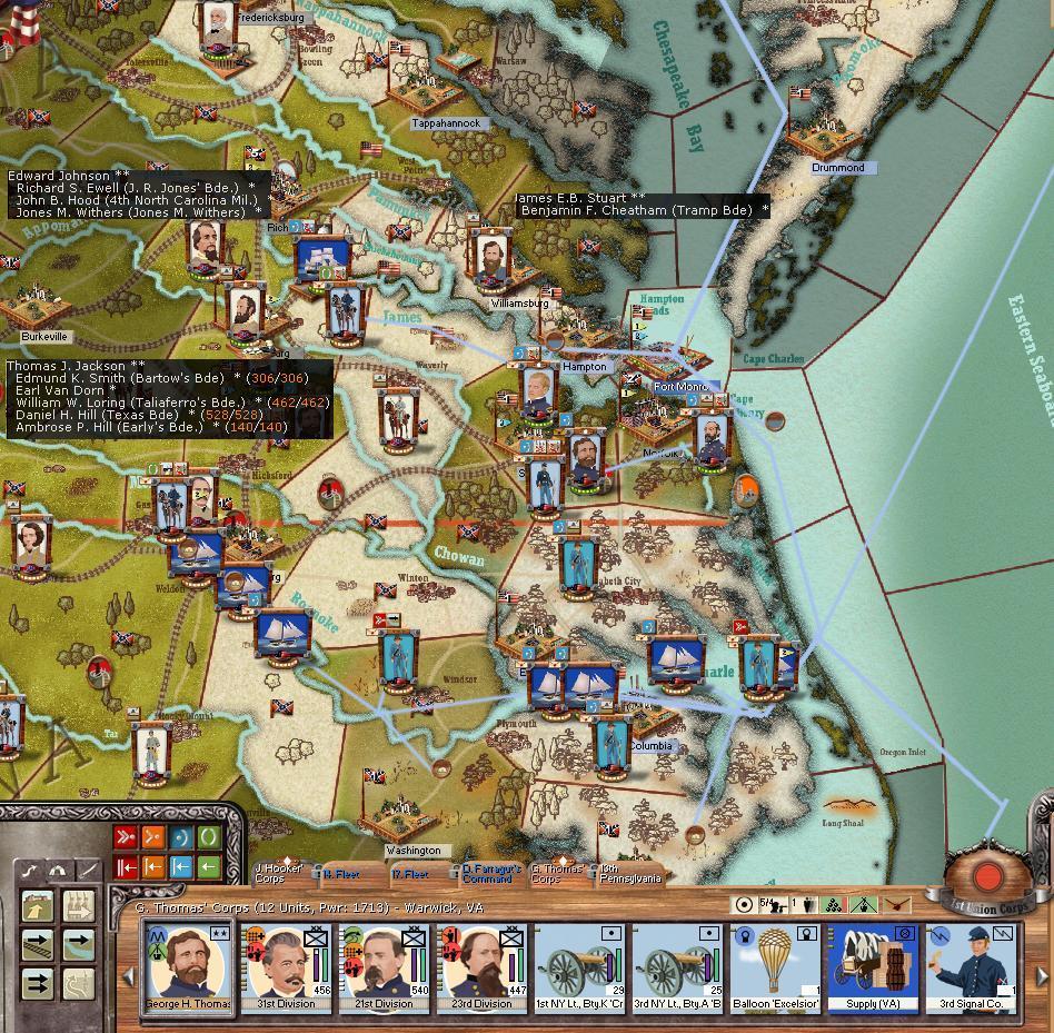 The has arrived safely around Suffolk and Norfolk! General Meade's corps is commencing seige operations against Norfolk itseld, while Thomas' and Hooker's corps are secuing the harbour at Suffolk. I had wanted to repair the rail lines when I sent the turn in to MrT, however, it looks as though I forgot to click the special order :bonk: