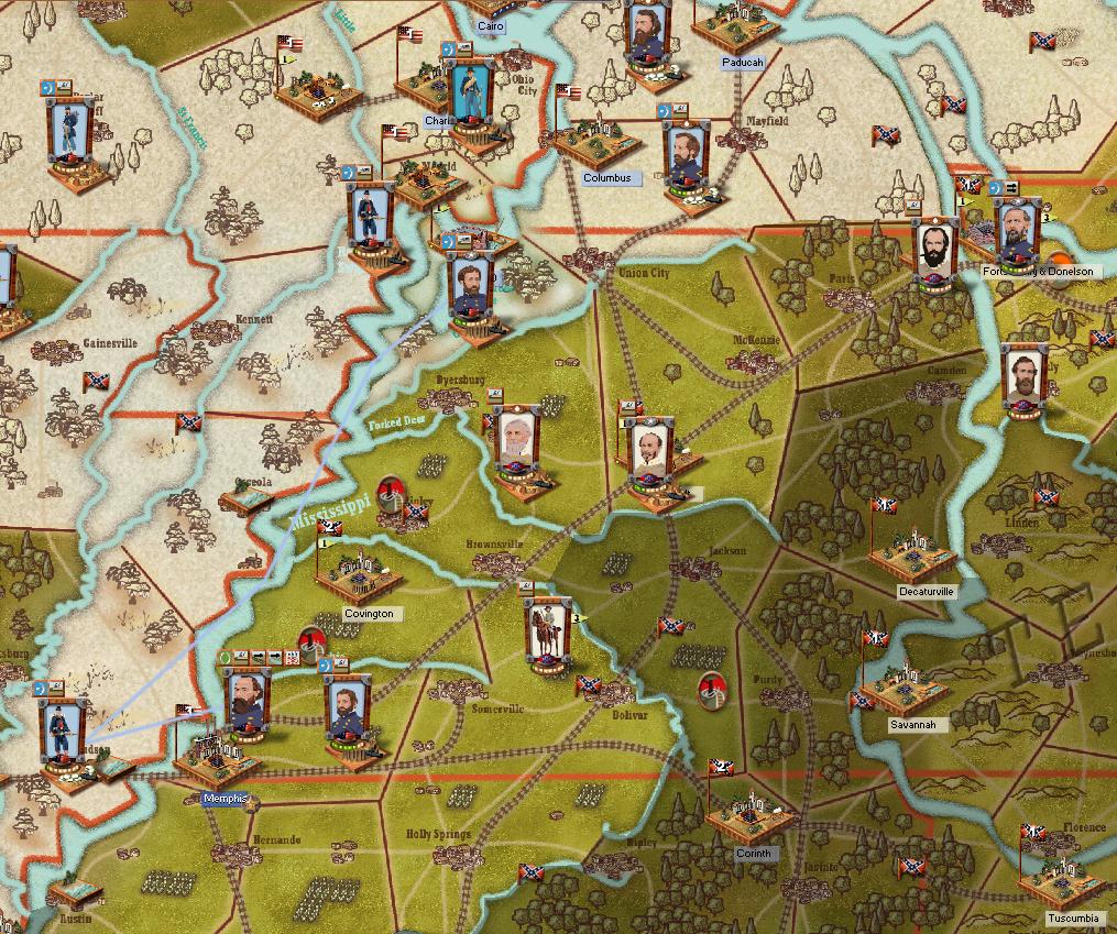 As such, a fleet under Porter willmove down river and attempt to shake out the rebel fleet as well as to blockade Memphis. I also want to get ships down there to stop and reinforcements moving along the river from reinforcing Hardee and Price in Arkansas or relieving Little Rock.