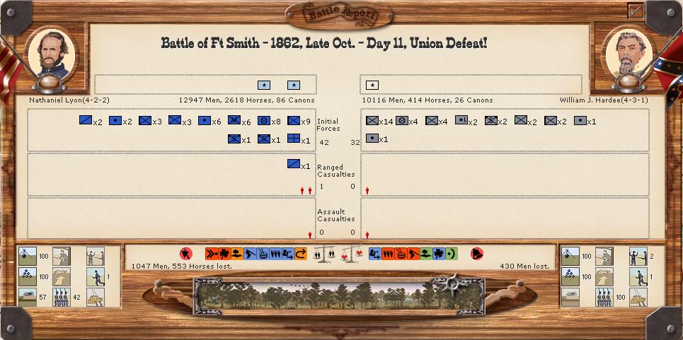 The army is pretty bad shape. General Forrest tried to break the seige and was defeated, however, I am losing men quickly at this pace and am unable to bring in replacements effectivly here.