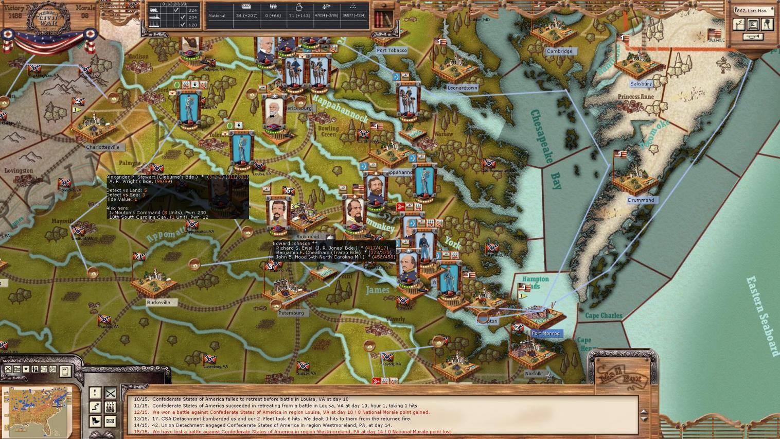 So the winter operation for Richmond was total failure. With Jackson back on the scene I don't think I have a chance of taking the city in the near future, so, I'm going to to stop going right for the jugular and start taking out some limbs. First up, Norfolk.