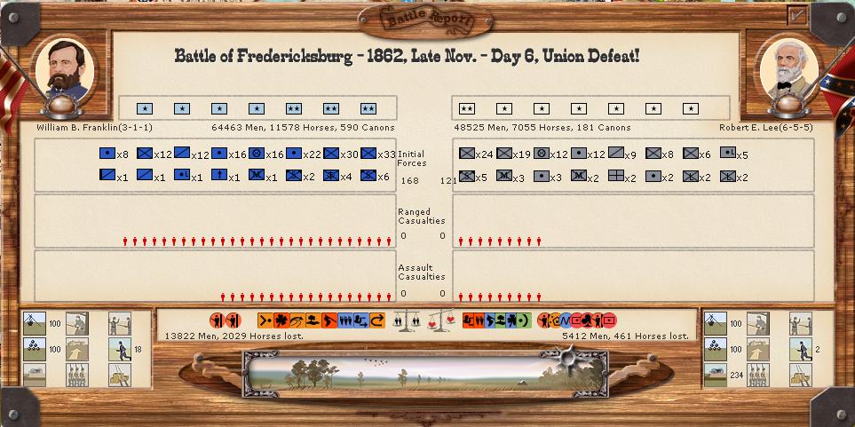 enf91 wrote:Yikes. Your last battle at Fredericksburg had about the same number of casualties in about the same distribution as the real-life battle of Fredericksburg. And that one led Burnside to resign!