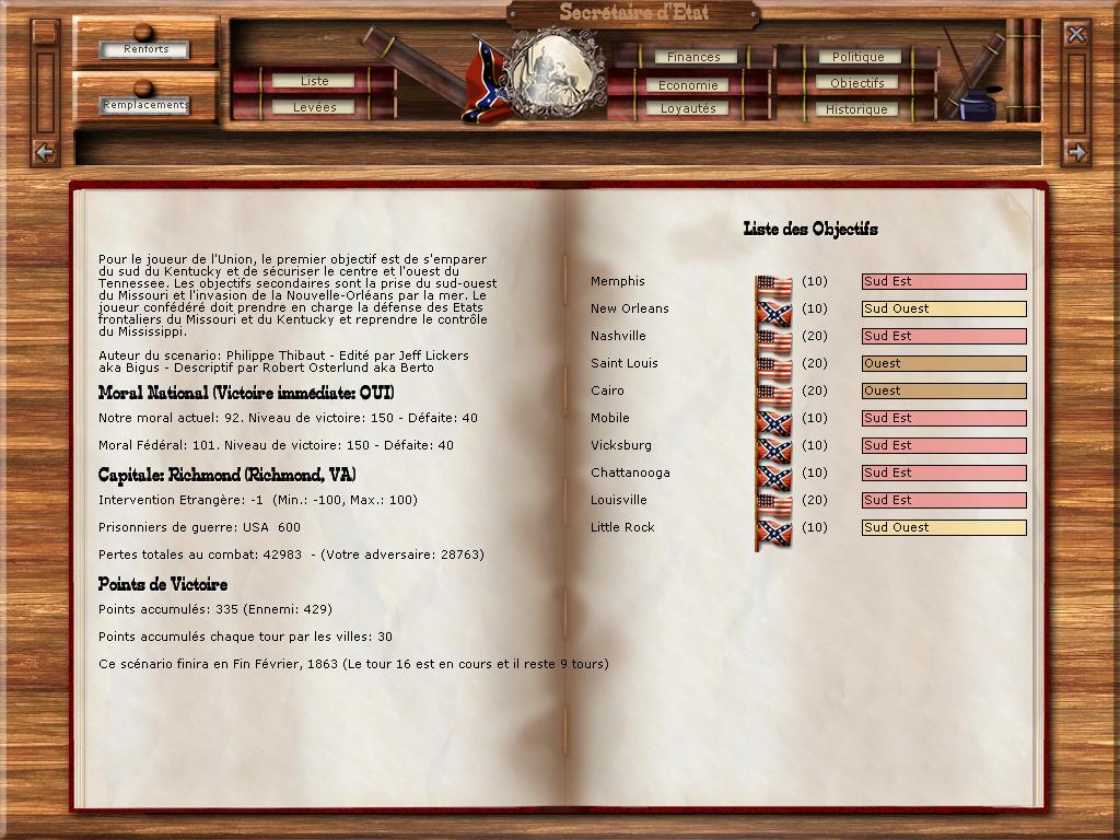 Résumé des conditions de victoires : soit briser le moral de son adversaire (pour le Nord par la prise des villes stratégiques de Memphis, N. Orlean, Mobile, Vicksburg, Chattanooga, et pour le Sud par la capture de Nashville, St Louis, Cairo et Louisville), soit gagner aux points après 24 tours en février 1863.