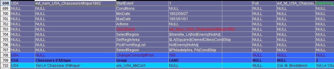 Shouldn't the EvalEvent be evt_nam_USA_ChasseursAfrique1862, instead of CSA? The USA event is in the USA Events file, and triggers if New Orleans is US owned with no adjacent Confederate units between 27 Sep '62 and 1 Jan '63. It gives the USA a regiment and 100 conscript points.