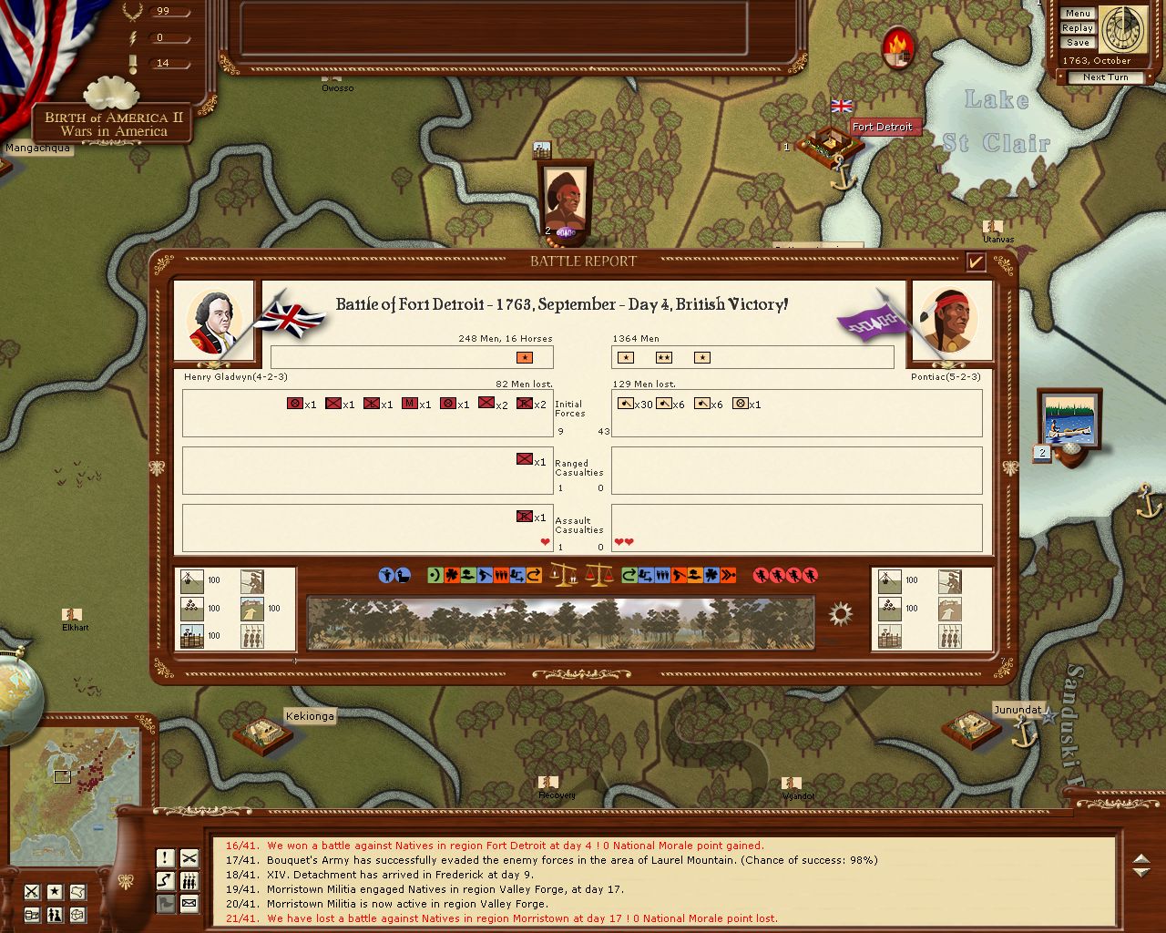 A second attack is repulsed and Pontiac forced to retreat from the region. The situation at Detroit is now critical with very low supply and many injured. The British must try once more to get relief through to the fort, but with the loss of fort Erie and the schooner, this will be a difficult task.