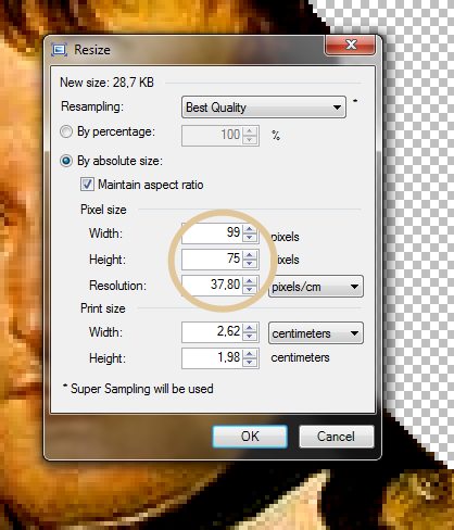 Edit and select all. Edit and copy. And edit and paste as new layer on the background with the oval. Note that it is bigger than the canvas, so a dialog appears asking expand or keep the canvas. Select cancel. First it is better to resize. Go again to the picture without the background and image resize. Dupont is around 75 pixels high. So resize Napoleon to a height of 75 maintaining the aspect ratio