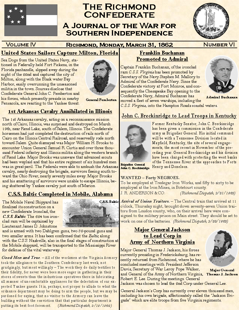 I've tried that unsuccessfully, and am pretty concerned about a growing Federal army in Bowling Green, Kentucky which is lead by U.S. Grant. I am trying to build a wall of defense along the Tennessee - Kentucky border because of it. So I'm hesitant to transfer too many troops west to initiate an offensive on Cairo. But, it looks like I need to take a chance here. I'm about two months ahead of the newspaper issues that I have released, so it will be at least Fall before I can do it. I may not be able to do it, I fear, before winter kicks in.