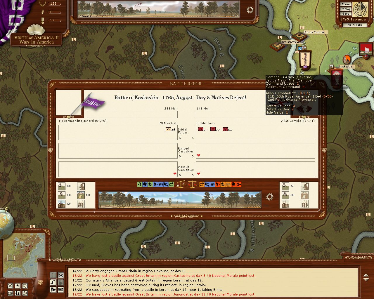 The Michilimackinac garrison repel a sizable Indian force but take 50% casualties. The Indians will be back.