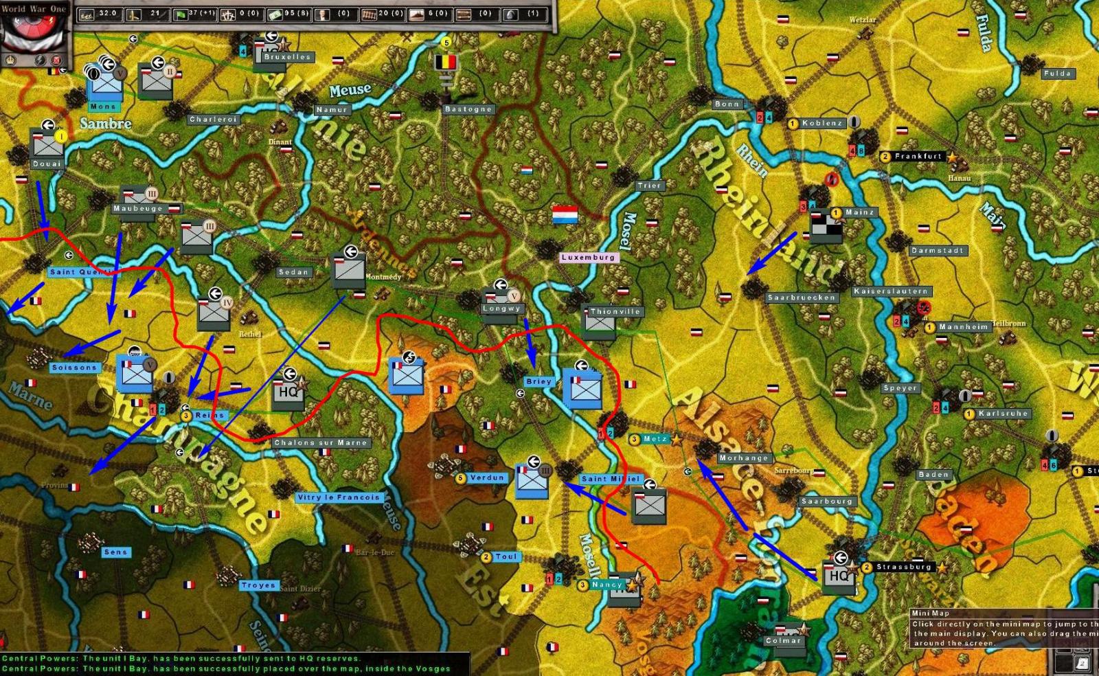 The 2nd and 3rd Armies had their advance cut short-the 3rd simply because it was attacked before it moved. the 1st, 4th, 5th and 6th Armies all achieved their objectives. This means that the French Army which had advanced and captured Metz is now surrounded. Before the AI realized it was going to be surrounded, it continued its advance into the Rhineland. There was some hope that would not occur, as it has made a mess of the front in that area. However, the end result should be the anihilation of all Frech forces on German soil. (well, if you are French, you might consider it French soil :) )