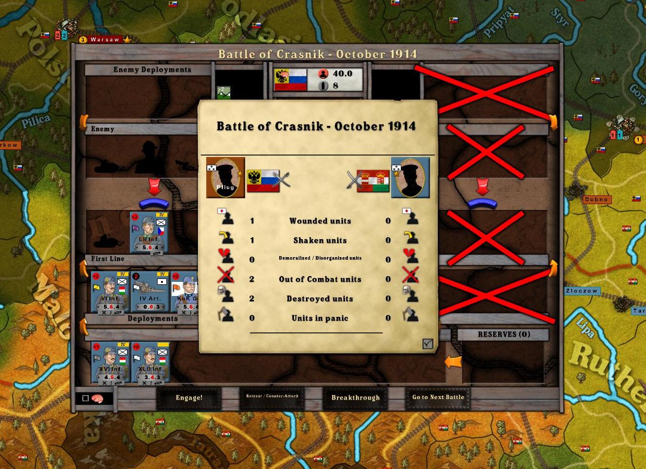 The A/H 4th Army also had some good fortune. It was supposed to launch an attack, but the Russians beat it to the punch-the Russians attacked first. As it turns out, this was a good thing. The Russian Army was quite large and could likely have defeated the 4th Army if it was defending. As it was, the 4th Army won another impressive victory.