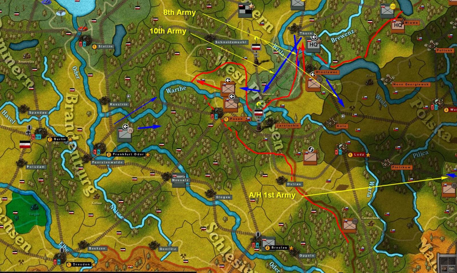 There were only two offensive moves ordered; one by the 1st Army to capture Rzin and by the 4th Army-basically securing the front to its right flank. The first Army was also tasked with expanding its bridgehead across the Wisla by sending one weak Inf corp north and a Cav corp to the south. There is no Russian resistance expected in those areas.